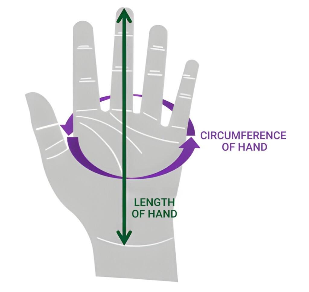 • Measure from the tip of the middle finger to the base of the palm. This measurement is important for determining the glove’s length and fit.